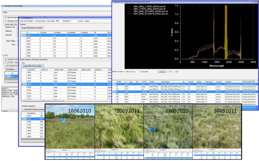 With the client, simple search queries over periods or research areas as well as complex queries concerning habitat or state of a single research site become possible. With the graphical display of the in-situ measured spectra, simultaneous access to phenological descriptions, photographs as well as other metadata, this spectral library allows an extensive study of natural dynamics of our environment from a remote sensing point of view.